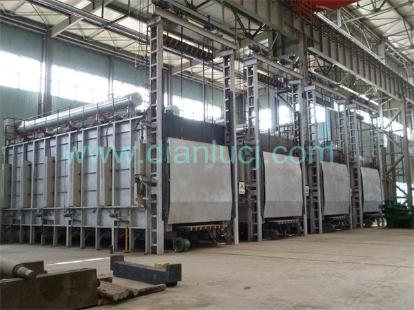 臺(tái)車式燃?xì)鉅t采用臺(tái)車式結(jié)構(gòu),需處理的工件擺放在臺(tái)車上,裝好工件后的臺(tái)車由臺(tái)車的牽引電機(jī)驅(qū)動(dòng)進(jìn)入爐內(nèi),進(jìn)行加熱,臺(tái)車與爐體之間間隙通過密封槽和保溫棉密封,以避免熱量外溢。設(shè)備在工作中,裝在爐膛兩側(cè)的電阻帶、爐門、后墻和爐底的電阻絲將散發(fā)的熱量通過輻射對(duì)工件進(jìn)行加熱,以保證爐溫均勻性。打開爐門,臺(tái)車開出爐外,由人工將處理好的工件卸下,再裝上新工件進(jìn)行下一爐。